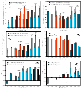 图1.(A–C)凋落物汞浓度、凋落物生物量和凋落物汞沉降的变化;(D-F)哀牢山东西坡凋落物分解过程中降解速率k、汞浓度和汞质量的变化。