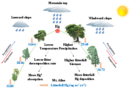 研究结果表明:(1)植被、气候和地形引起树木生理因子的变化是控制不同海拔处凋落物汞浓度差异的重要原因;(2)凋落物汞沉降通量随着海拔提高而显著增加,并且同海拔处迎风坡的凋落物汞沉降通量显著大于背风坡;(3)凋落物生物量是控制凋落物汞沉降总量的主要因素,高降雨量通过增加凋落物生物量来提高凋落物汞沉降;(4)低海拔处凋落物中汞的质量发生损失,而在高海拔处实现积累;(5)凋落物分解过程中汞的动态主要受温度介导的凋落物分解速率控制,即高海拔森林的低温条件减缓了凋落物分解速率,使凋落物中的汞结合位点可继续吸收大气汞,从而使分解过程中凋落物中汞的质量持续增加。
